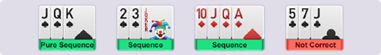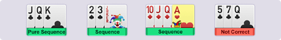 A sequence consists of three or more cards of the same suit in order.A PURE SEQUENCE is a sequence without jokers.IMPURE SEQUENCES are sequences that can contain jokersNOTE: IMPURE SEQUENCE is not valid until you have a PURE SEQUENCESETS