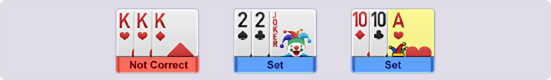 Sets are a group of 3 or 4 cards with the same rank but different suits.Sets can contain Jokers.NOTE: Sets are not valid until you have a PURE SEQUENCE and an IMPURE SEQUENCEFINISHTo win game the player must call for a Finish with the following